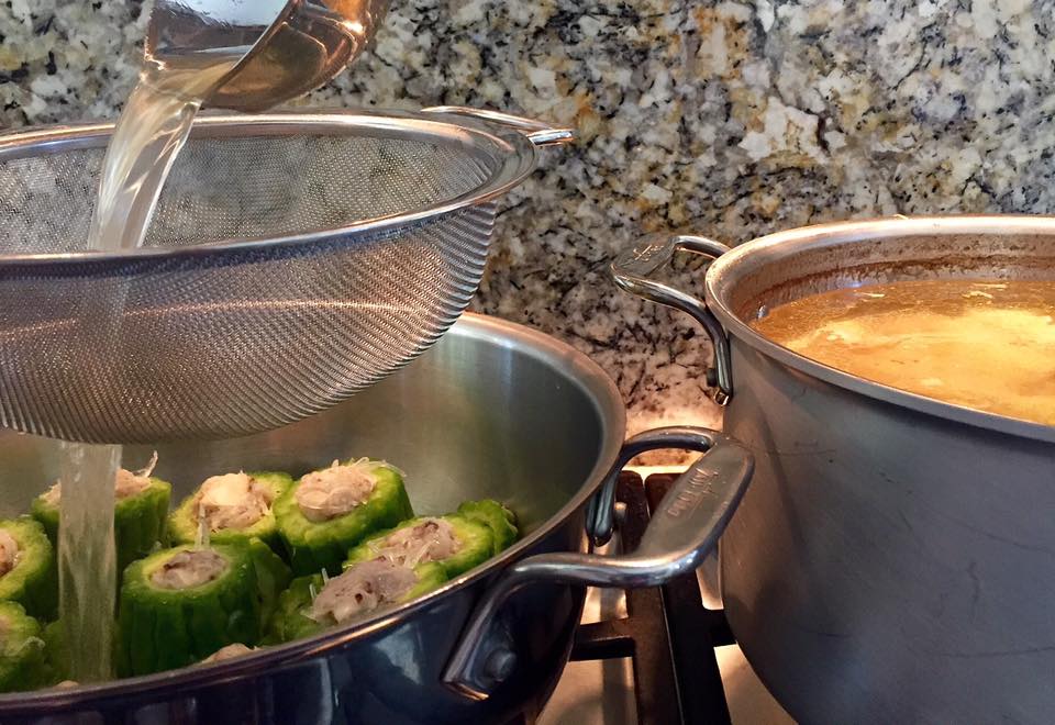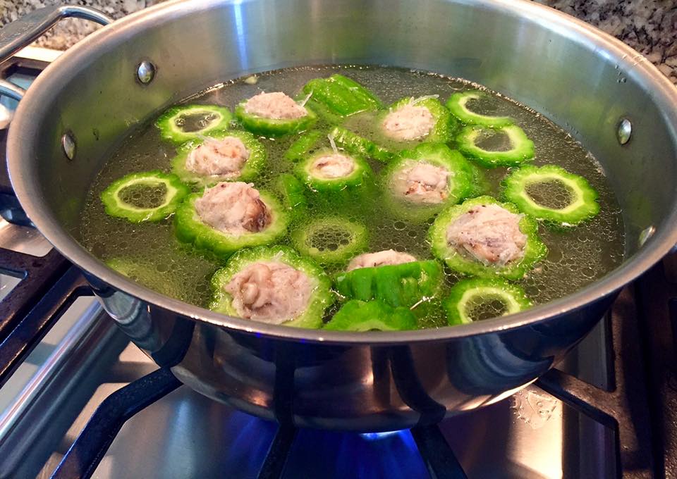 Bring the pot to a boil on high heat. Turn the heat down to reach a low boil, simmering for about 20 minutes until the stuffing and bitter melon fortify the broth and release flavor into the broth.