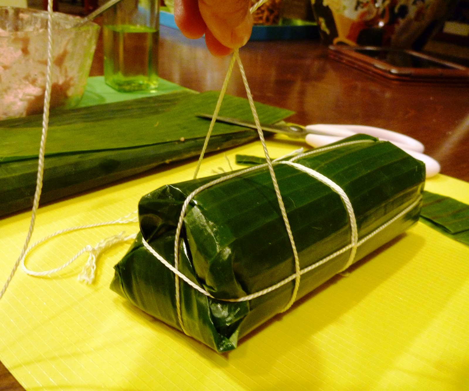 Wrap pork paste in at least 3 layers banana leaves. Make sure to keep your hands moist with cooking oil and also brush oil on the leave to prevent pork paste from sticking.