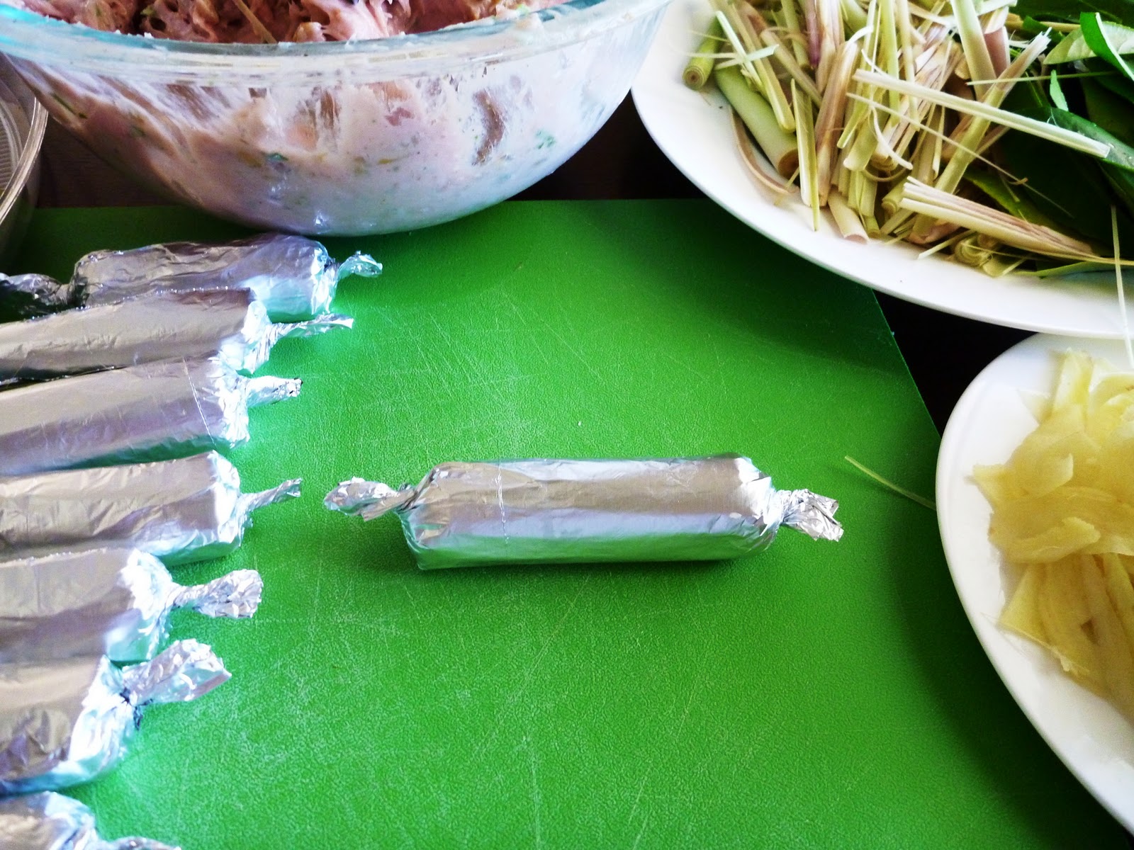 Lay banana leaf on a cutting board, place a lime leaf,  about 1 tablespoon of the mixture.  Then place a lemongrass stick on one side and a slice of ginger on the other side of the mixture.  Mold the mixture into a log and roll tightly.  Place an aluminum foil on a cutting board, then place a banana leaf roll on it and roll it up.  Twist  the ends of the foil tightly.