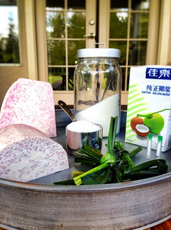 In just under 30 minutes, I can get back to my cozy lazy chaise with a cup of warm taro coconut pudding filled with the wonderful aroma of pandan leaves and vanilla.   Taro is a purple root vegetable that is used in Asian cuisines.  I love the starchy, sweet, and mild flavor of the purplish taro and even more so when it’s served with a deliciously rich flavored coconut milk and chewy tapioca pearls which is the starch extracted from cassava root.