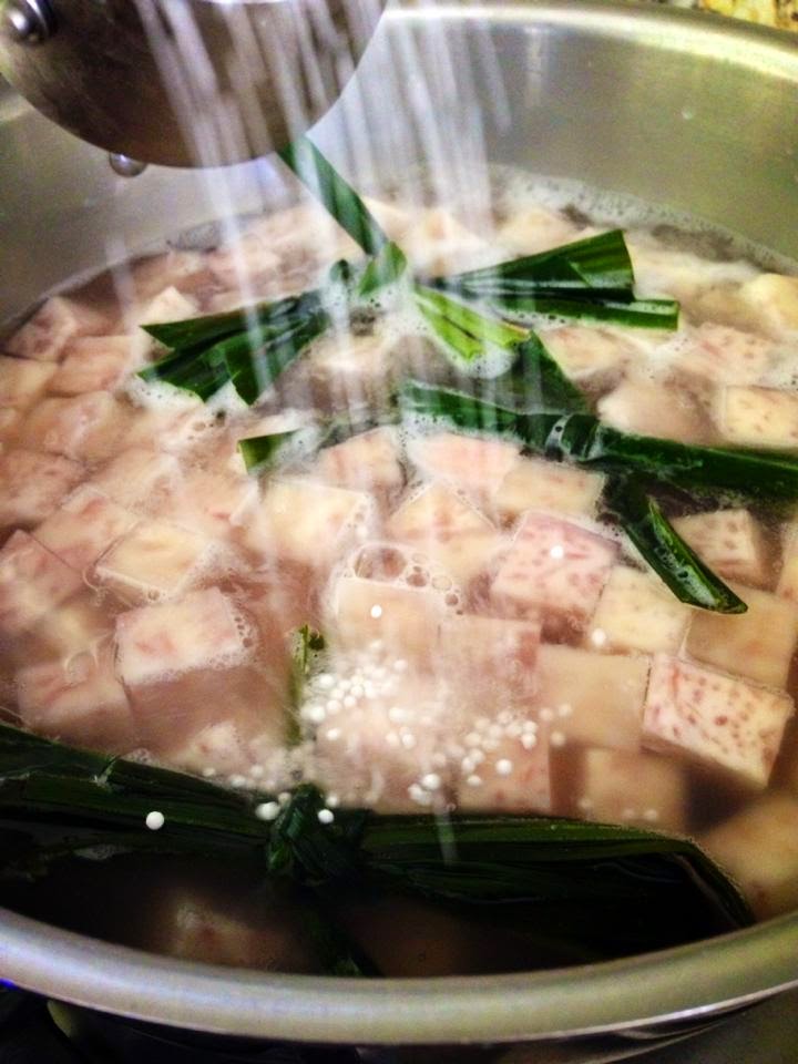In a pot, add 6 cups of water, knots of pandan leaves, and taro. Bring it to a boil.