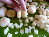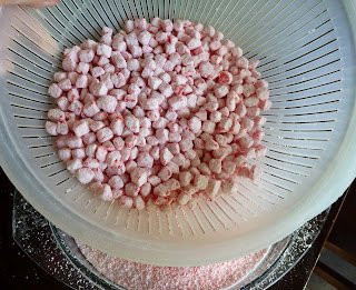 Bring a pot of water to boil.   Prepare a bowl of ice water on a side.  Once the water boil add one batch at a time of  tapioca-chestnut mixture to the pot.   Use a pair of chopstick to separte the imitation pomegranate seeds to prevent them from sticking together if needed.