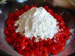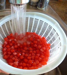Imitation Pomegranate Seeds which are made of water chestnut diced into small cubes about the size of the pomegranate seeds coated with a tapioca starch. It’s quite fun to eat these imitation pomegranate seeds as the insides are so crunchy from the water chestnut and the chewy tapioca cover.  It’s best to enjoy  Hạt Lựu (Imitation Pomegrante Seeds) right away.  If not, they will absorb the water and the beautiful vivid red color will fade and the tapioca coating will expand, making them look unappetizing.  If you any of you know the secret to keeping Imitation Pomegranate Seeds long and appetizing, do share.
