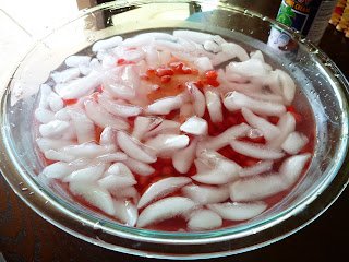 Wash and rinse water chestnut.  Dice the water chestnut into small cubes about the size of  the pomegranate seeds.  Add  red food coloring and a tablespoon or two of water and mix until chestnut cubes cover with red.