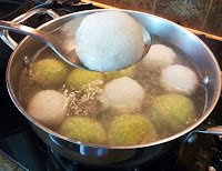 Bring a pot of water to boil. Drop just enough of the mung bean tapioca pearl balls into the boiling pot. Tapioca pearl balls are done when they float. Let it cook for another 5 minutes to ensure it cooks all the way. Remove the tapioca pearl balls and drop them in the simmering ginger syrup pot. Keep the syrup pot on low heat so that the syrup absorb into the tapioca pearl balls as this will make them taste better.