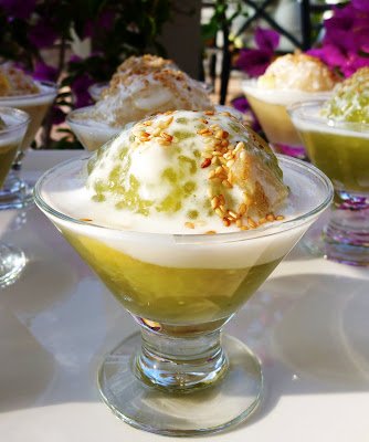 For those who like tapioca pearls, this dessert has a distinctively chewy soft texture of the tapioca pearls; the tasty mung bean filling is packed with flavors; it’s fused with pepper, salt, sugar and the wonderful aroma of fried shallot mixed with mashed mung beans; the rich taste of coconut milk and the sweet ginger and pandan flavor syrup that is made with white sugar – which I much prefer over brown sugar – syrup will delight your palate.
