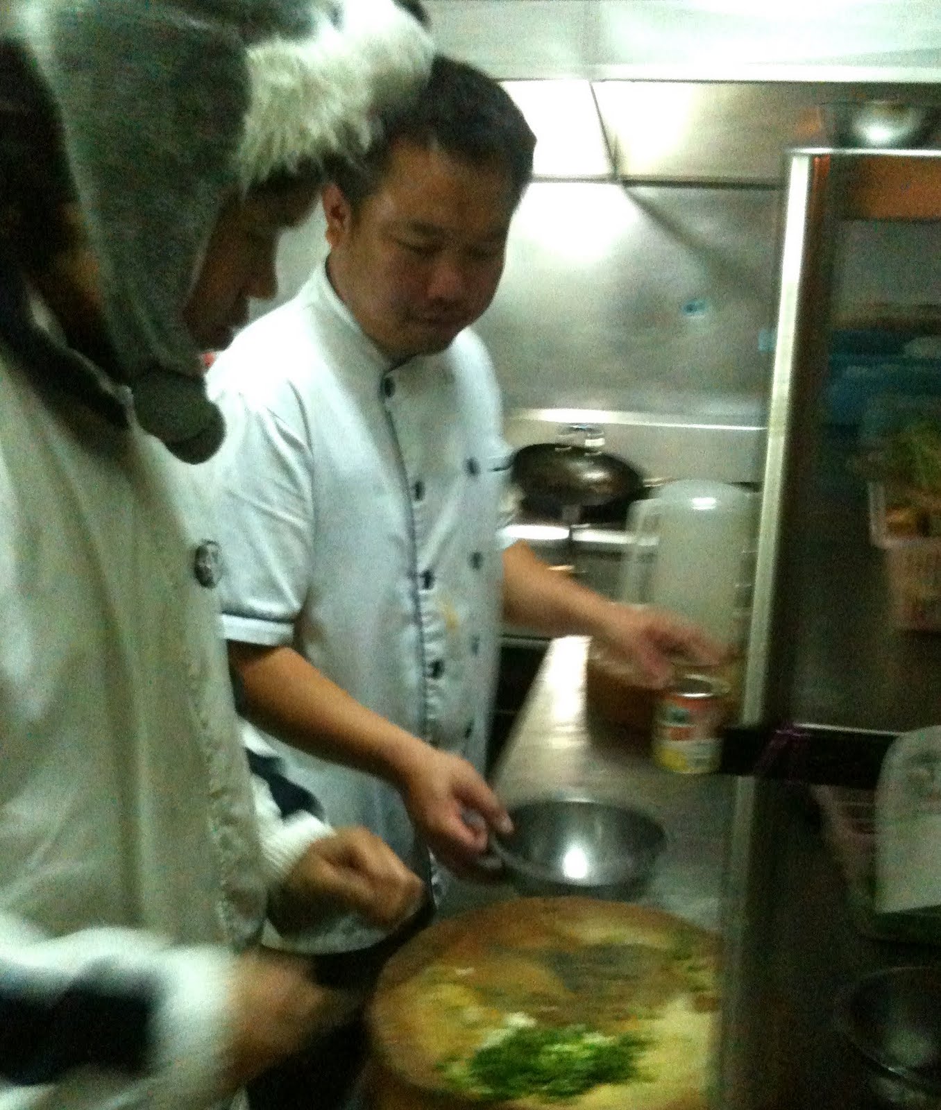 They lit up the stove and got a wok and a metal soup pan on the go. They put about a tablespoon of vegetable oil in the wok and a pint of water in the pan. Soon the oil was smoking and the water bubbling. In the mean-time, Si finely chopped about eight fiercely hot red and green bird eye chillies.