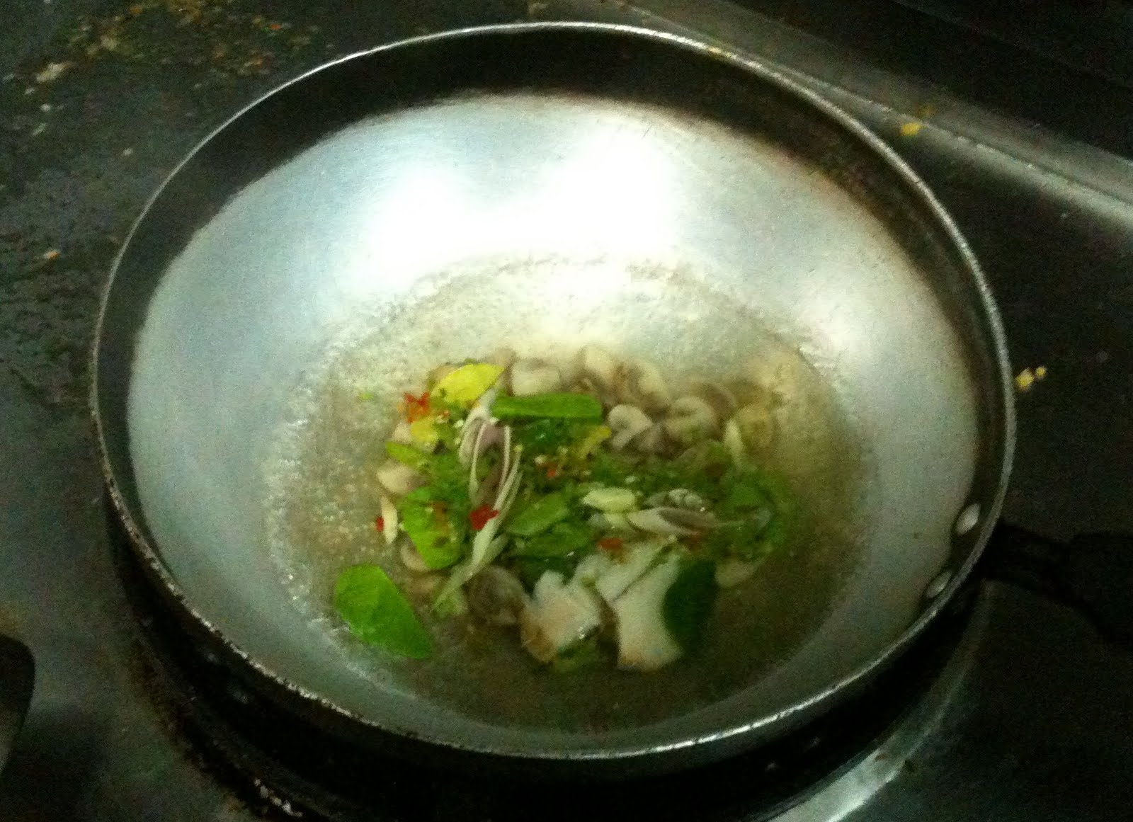 Si moved on to other soup ingredients – putting lime leaves, lemon grass, basil leaves, galangal, sliced button mushrooms, spring onions and the chopped chilli into a bowl. He chucked the contents into the soup and let it bubble away for a minute.
