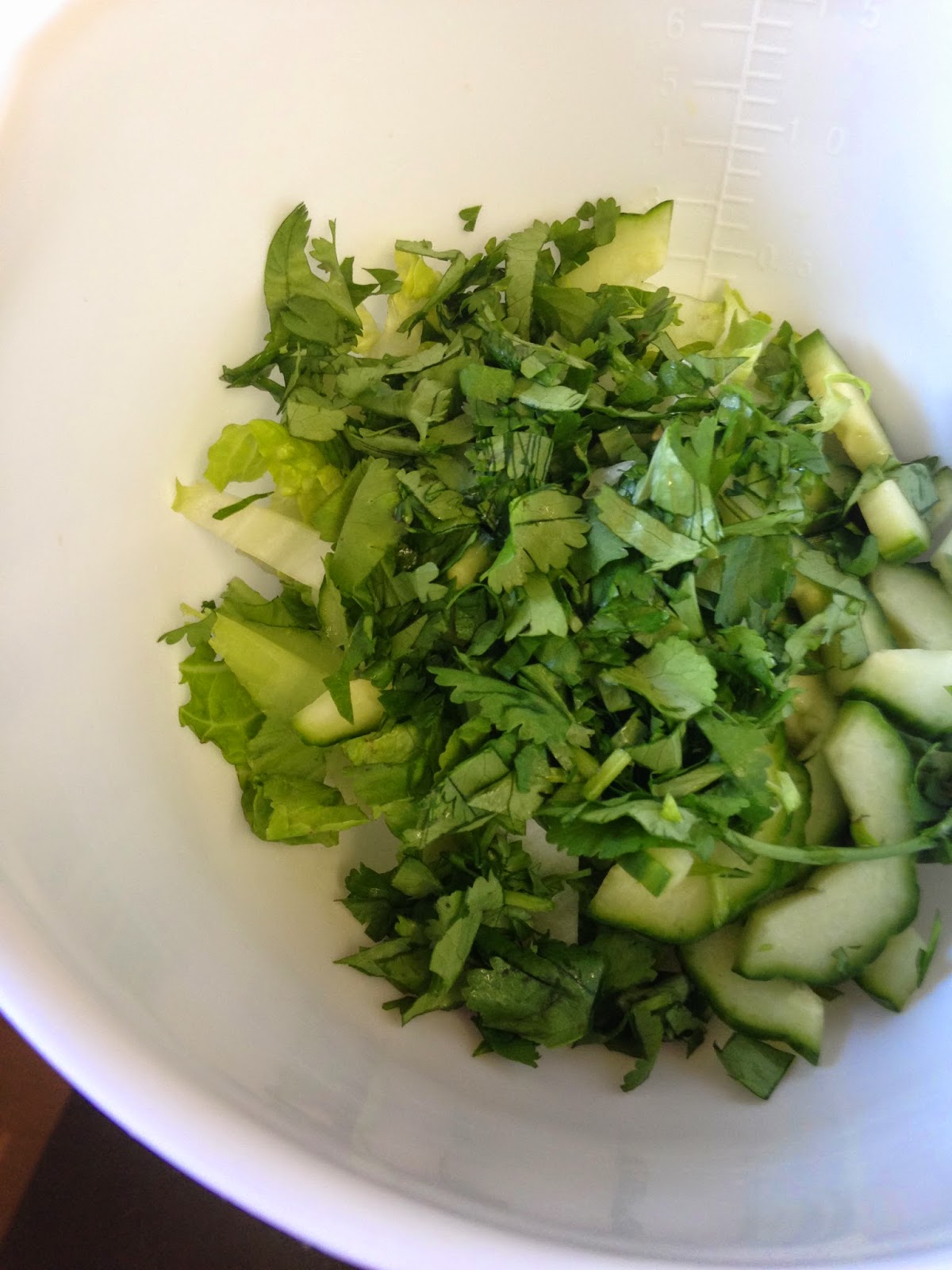 By hand, halve the romaine leaves through the middle. Use the top parts to garnish your taco bowl and finely chop the remainder. Place in a bowl with the cucumber slices and most of the fresh coriander.