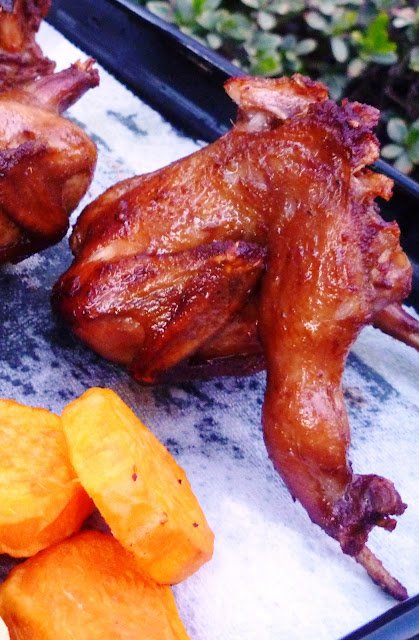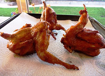 One of my favorite dishes to serve on this holiday season is Chim Cút Rôti (deep fried quails). I like to serve Chim Cút Rôti with mashed potatoes or black rice (xôi nếp than) with Chinese sausages (lạp xưởng) and thousand year eggs (trứng bắc thảo) and a side dish of pecan butter sweet potatoes. Quails marinated with some of my favorite ingredients like garlic, shallots, curry powder and five-spice powder give this dish a full, wonderful aroma.