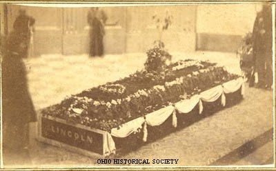 That’s not the end of the story in Columbus. So many thousands of visitors had not had a chance to pay their respects that the catafalque was replenished with flowers, so people could still see how things appeared in those brief hours the president lay in state. The Ohio capitol rotunda remained thus for visitors until May 4, 1865, when Springfield, Illinois held the final funeral for Abraham Lincoln.