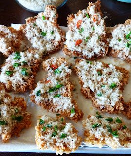 You should have two trays of crispy rice crackers. Place each tray back in the oven for about 5-7 minutes. This process is to dry off the fish sauce and to keep the rice crackers crispy for a few weeks. Continue with the second tray.
