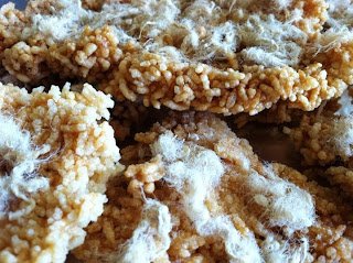 When the rice sheet is cool, break it into pieces. The rice will expand once you fry it so be sure the size of the rice pieces are smaller than the fry pan.