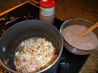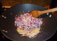 Heat 1 1/ 2 tablespoons of oil on a pan and saute shallots, garlic and onion. Once the mixture is slightly golden, add the clams, salt, sugar, pepper, a pinch of msg and paprika. Stir for another two minutes. Remove it from the heat.*