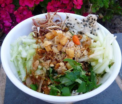 Cơm hến is simple yet an intricate dish that fuses together a variety of flavors from clams, fried pork fat, clam broth, roasted peanuts, crunchy rice cracker, chilli pepper, banana flower, star fruit or crisp, juicy and tart Granny Smith apples which make it perfect for cơm hến, mint herb, Vietnamese coriander (rau ram), bac ha (taro stem), fermented shrimp sauce and room temperature rice. These ingredients culminate in a distinctive balance of sweetness, saltiness, sourness, and spiciness with two separate crunchy textures. It’s sure to give your taste palate a workout! And once you’ve had a bowl, you couldn’t help but ask for more . . .