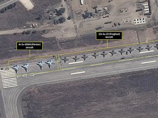 Russian SU-30 Flanker multi-role fighters (left) and SU-25 Frogfoot ground attack aircraft on the ground in Syria. These assets are now flying ground attack missions in support of Moscow’s objectives in the region (AllSource Analysis imagery via ABC News)