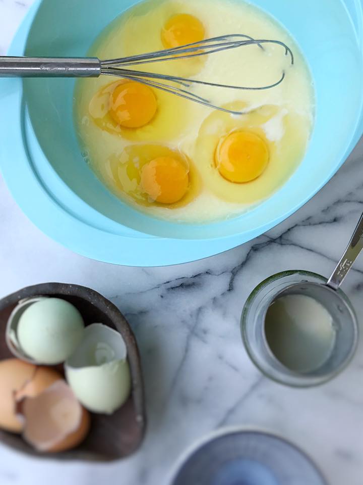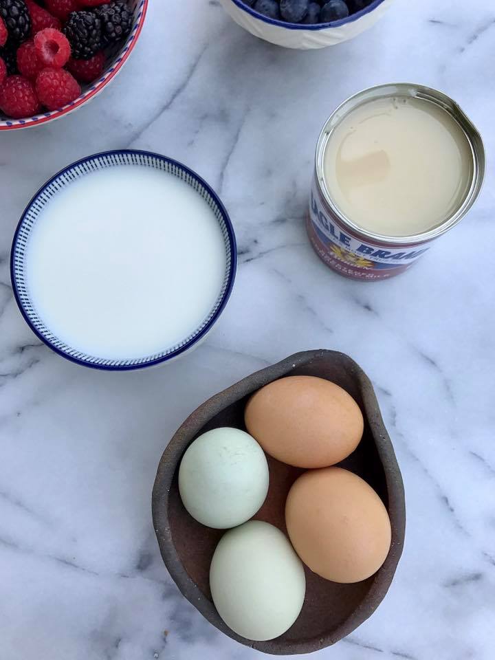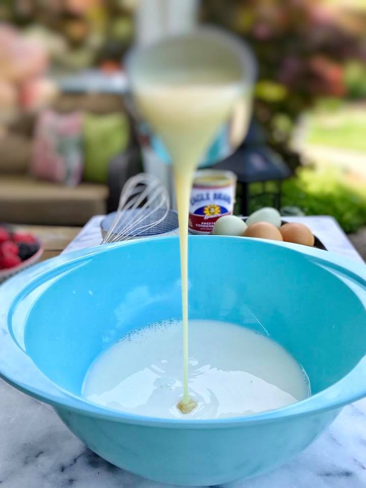 Whisk condensed milk and hot water or milk until combined. Add eggs and whisk until blended. Strain the mixture to remove any egg that has not been fully incorporated.