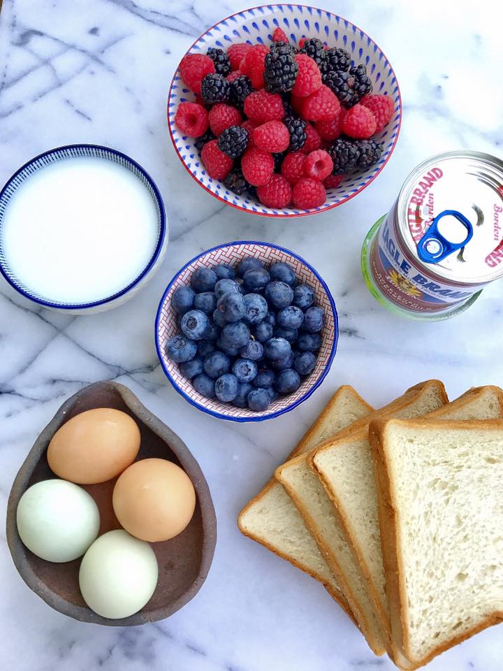 So I whisked up a can of condensed milk and fresh eggs and soaked Shokupan slices in the egg custard. When thick slices of bread are soaked in sweet, creme anglais custard, fried in butter and oil, doused in syrup and served along fresh fruits, what could be better?