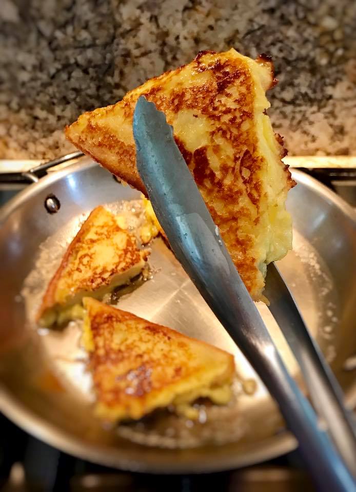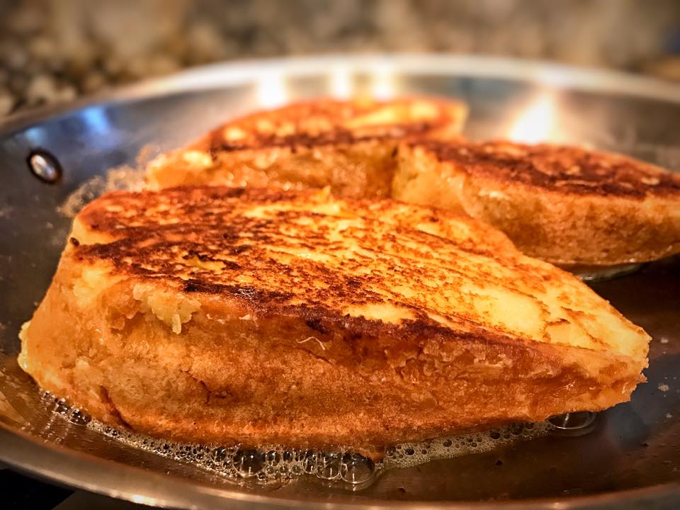 Fry bread until golden brown on both sides. After each batch, be sure to wipe out the pan with a paper towel, then add fresh oil and butter. Otherwise, the butter will burn and brown bits will stick to the next batch of French toast.
