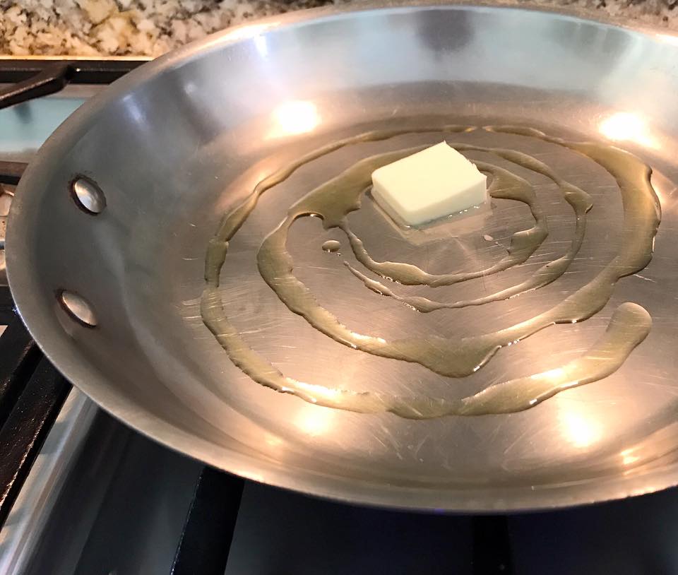 Heat equal parts butter and vegetable oil in a frying pan over medium-low heat. Using both butter and oil will help prevent the butter from burning.