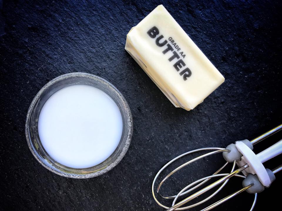 Beat 2 tablespoons of milk with 1/4 lb softened butter together on low speed for 1-2 minutes, or until the butter and milk combine. Then, mix on high for 2-4 minutes, or until the butter is light and fluffy.