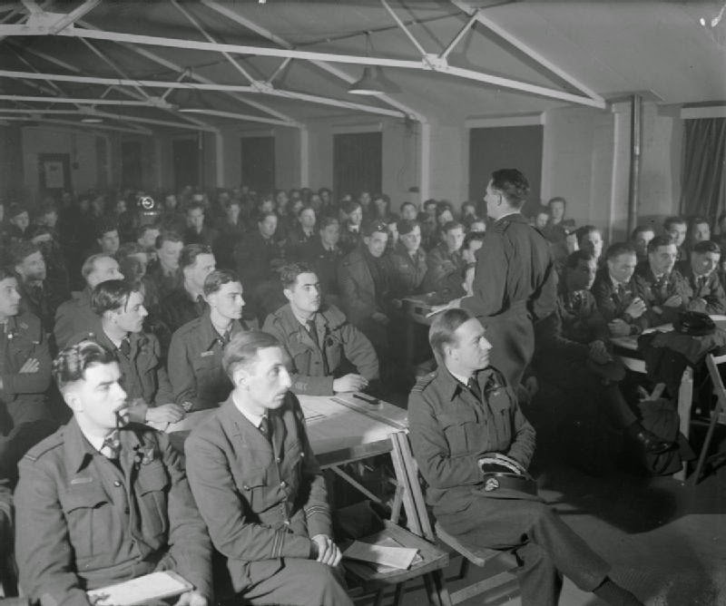 RAF Squadron Leader Peter Hill briefs bomber crews from Number 51 Squadron before the planned mission against Nuremberg, Germany on the evening on 30/31 March 1944. Hill was among more than 700 crew members lost on the raid, the bloodiest night in Bomber Command history (Imperial War Museum Collection)