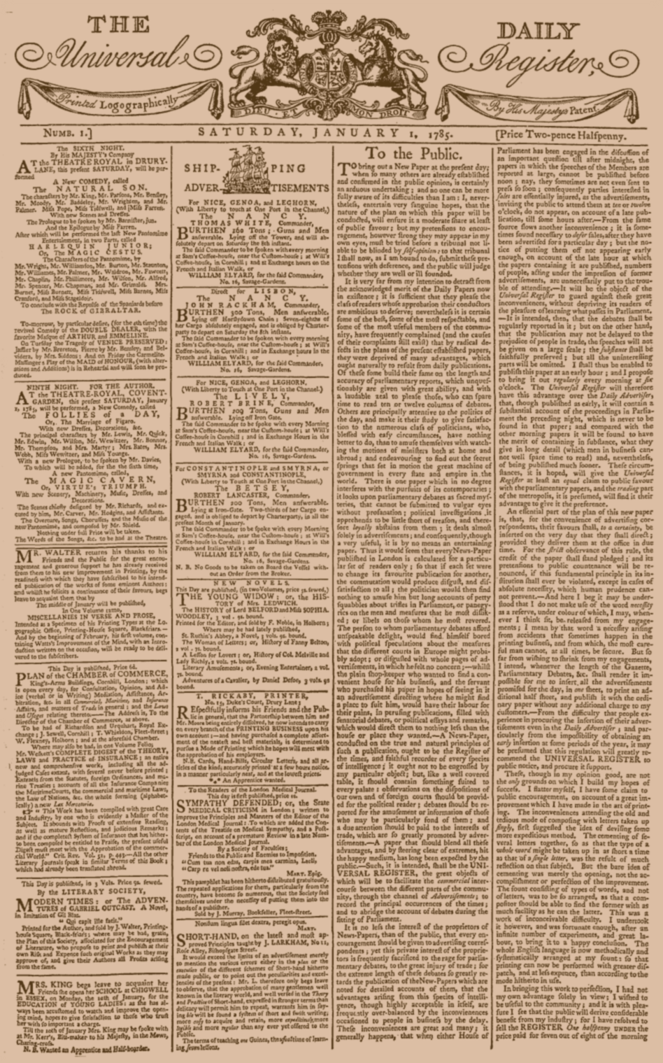 Walters started by printing books using his new method. Then, on 1st January 1785, he published the first edition of a daily newspaper called The Daily Universal Register, which he also edited. After three years, he changed the name of the newspaper to The Times.