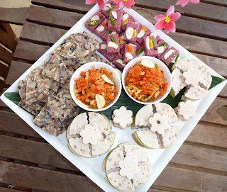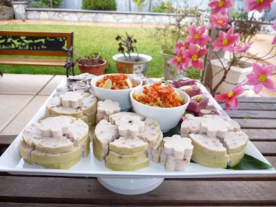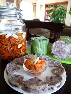 Giò Thủ is one of the popular dishes that we usually see during Tết. When we were in Vietnam, my mom always bought and prepared lots of food a week before the arrival of the New Year since food plays a large part in Tết celebration; she makes sure that there would plenty of food to last us for at least three days since it is taboo to work or cook during the first three days of Tết. It also would be bad luck otherwise to not have enough food at the beginning of the year. On the morning of the first day of the New Year, I would hurry down the kitchen to taste all the wonderful dishes such as nem chua (cured/fermented pork), chả lụa (Vietnamese ham), lạp xưởng (Chinese sausage), thịt kho trứng (braised caramel pork), bánh chưng, bánh tét (traditional Vietnamese steamed cakes), bún măng vịt (bamboo shoot and chicken noodle soup), củ kiệu (pickled spring onions), dưa món (pickled vegetables in fish sauce) and of course giò thủ.
