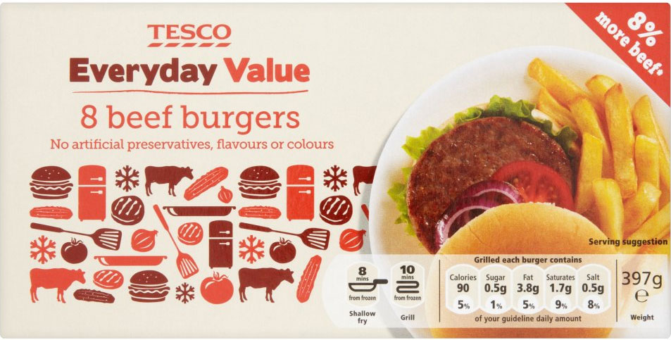 It says 8 per cent more beef on the Tesco Everyday Value Beef Burgers box, and promises no artificial preservatives, flavours or colours. But what Tesco doesn’t tell you is the pink slimy patties inside are made up of 29 per cent horse meat.