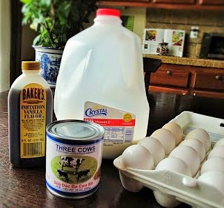 I remembered each flan was made in a very small round, 2/3 inch thick tin cup, about the size of a condense milk can. After it was done, the flan was flipped into a plate, and topped with shaved ice. Flan was made of eggs, milk and condense milk and these ingredients were expensive; therefore, flan was one of those expensive desserts in the 80’s.