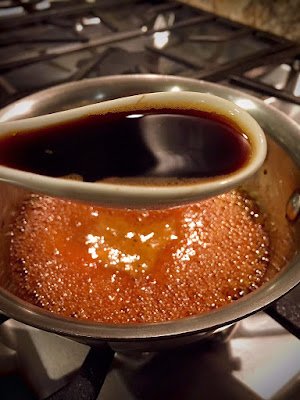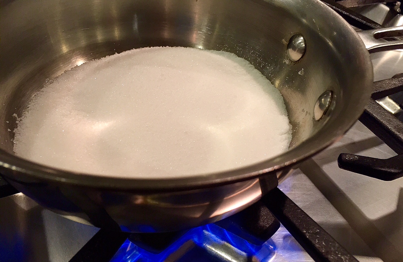Cook sugar in a sauce pan over a moderate heat. Watch the sugar closely as it heats. As the sugar begins to melt and turn from a clear liquid to a golden brown color around the edges, use a spatula move the liquefied sugar from the edges of the saucepan to the center. Be careful not to over stir the caramel- the sugar may start to clump up before it has a chance to melt. Caramel is done when it is just past the smoking point, and it has a deep amber color. At this point, turn off the heat and add the espresso if you like the taste of it.
