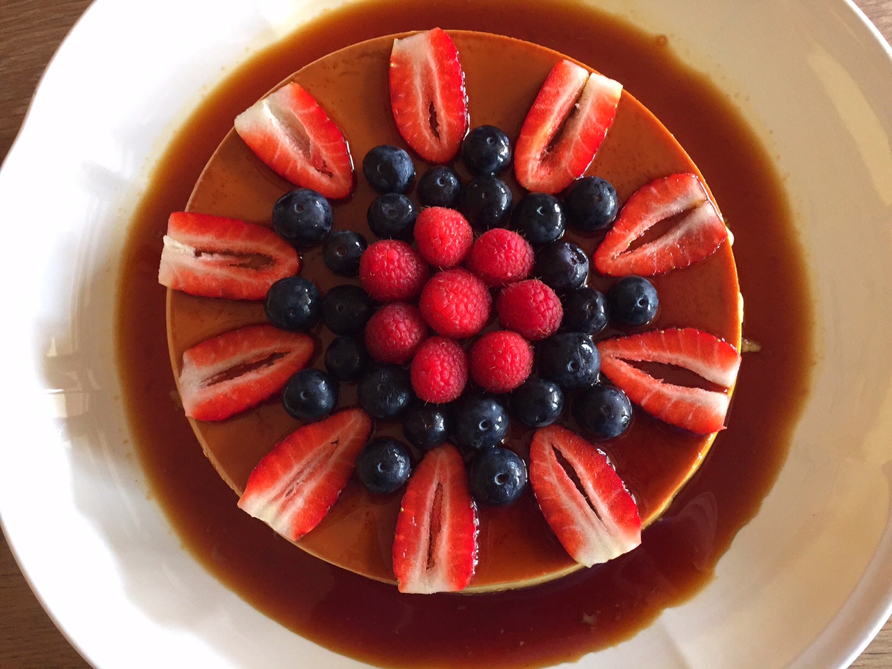 Transfer flan to the fridge and chill it for a few hours. Refrigerating the flan overnight is best.  When it’s ready to serve, loosen it from the pan with a knife and transfer onto a dessert plate and top with your choice of fruits or just eat it plain.