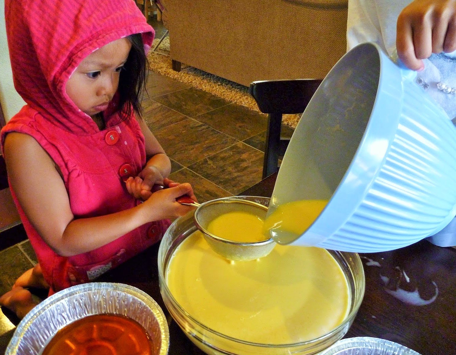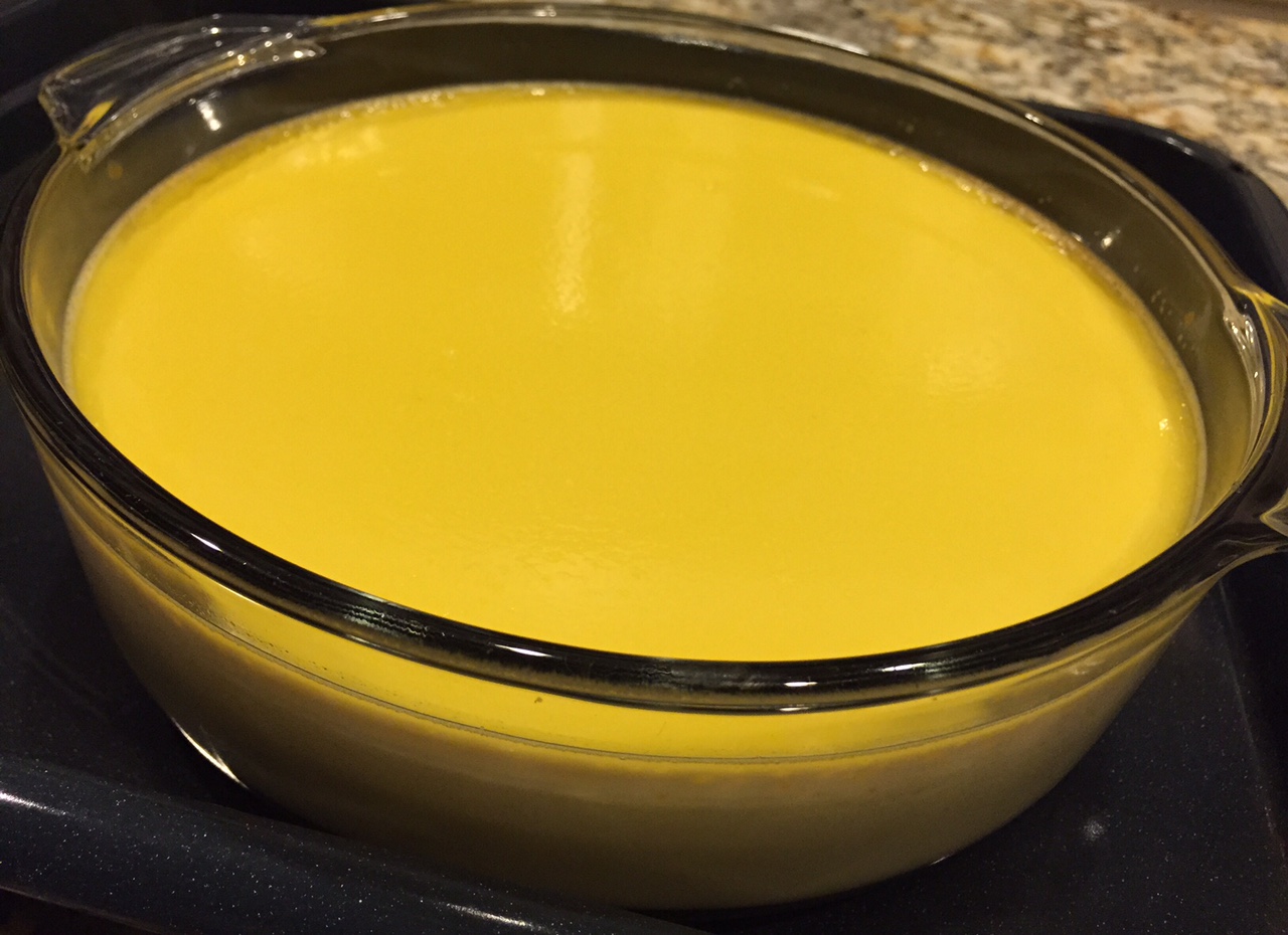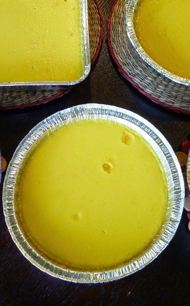 At this point, preheat oven at 350 degree.  Make a water bath for flan by placing a baking tray in the middle rack of the oven and add hot water to 2/3 of the tray.