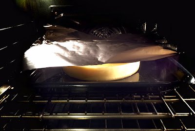Pour flan mixture in a baking pan, place baking pan in the hot water bath.  Place a piece of foil loosely on top of the baking pan to prevent flan from burning.