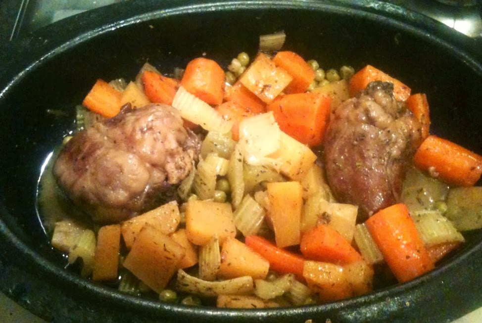 Take out, remove the foil, and stir the vegetables, and turn the hearts over. Add the peas, put the foil back on, and cook in the oven for another 15 minutes. Serve with a baked potato and plenty of English mustard.