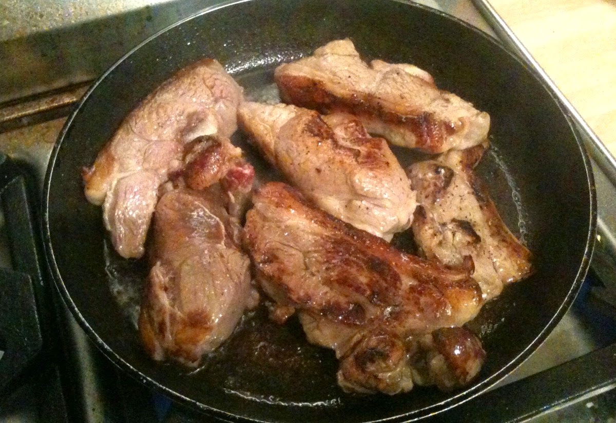 Heat a frying pan until it begins to smoke and then lay the lamb steaks in there, fat-side down. You don’t need oil as the fat will soon render down (see pic below).