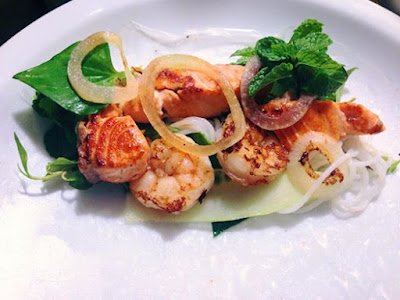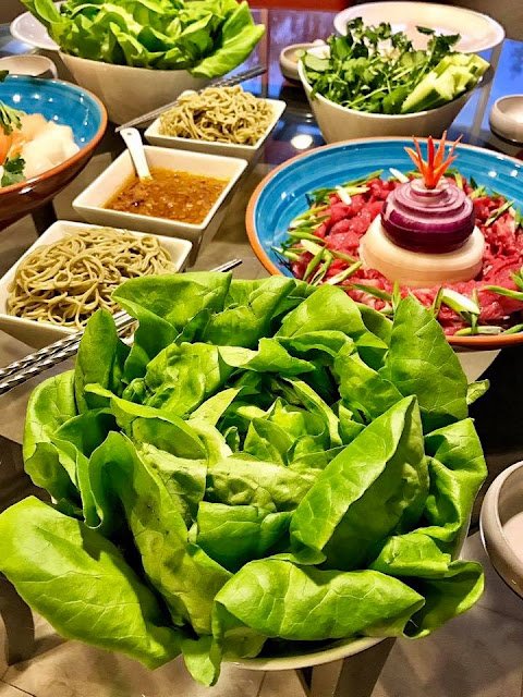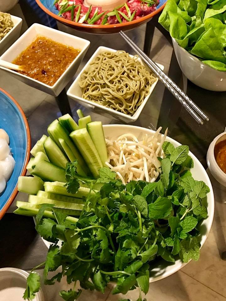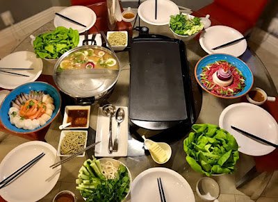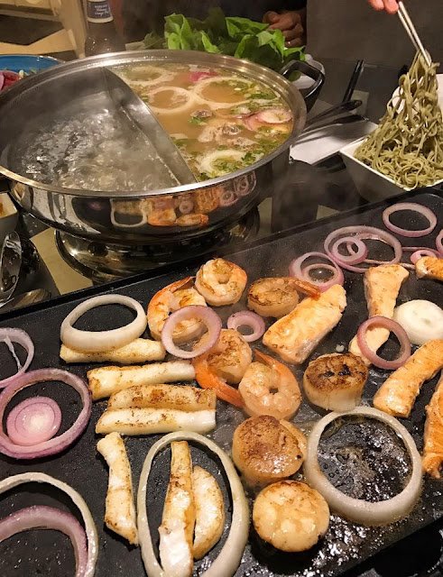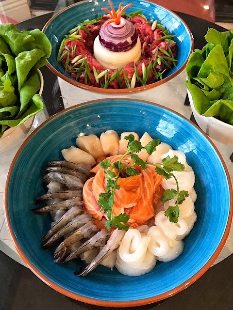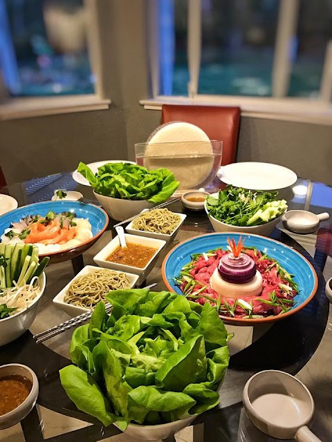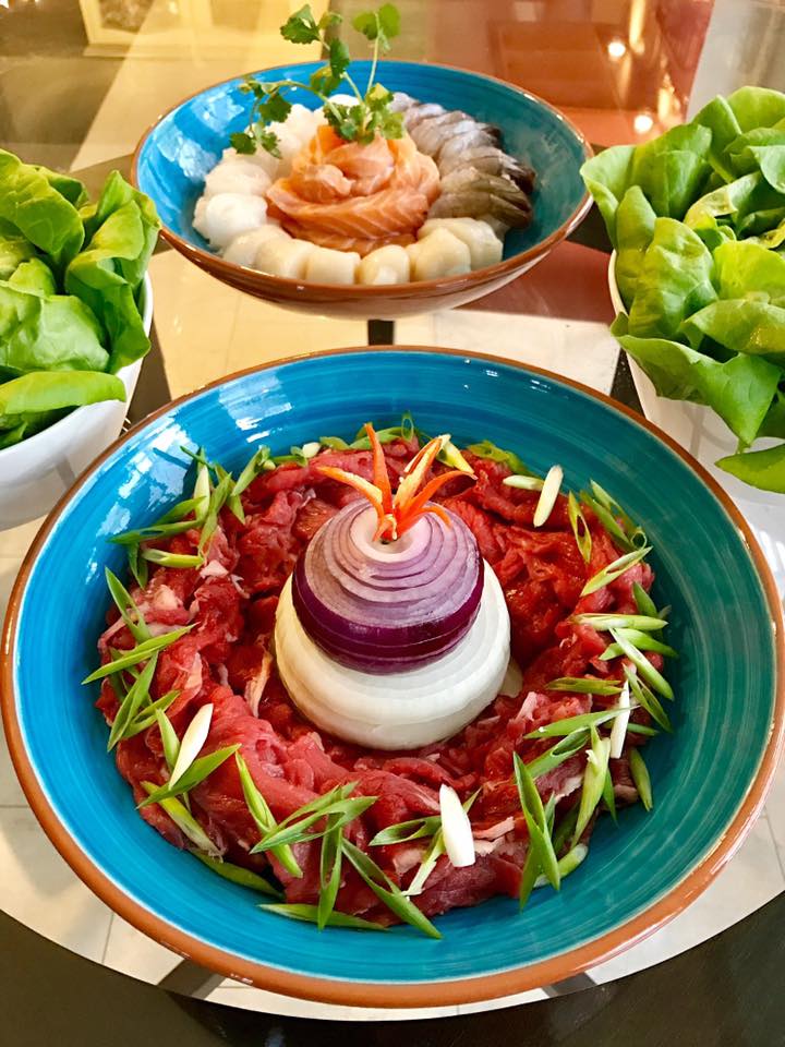 Fondue, paired with a griddle for grilling are perfect to be enjoyed with your family or friends gathering on the cold days.   With just half an hour, you can still surprise a nice meal for your guests or family when you get home late . This beef, salmon, shrimps, calamari, scallops grilled on a griddle with butter and sweet onion created a nice brown crust with beautiful aroma.  Wrap this with noodle, lettuce, herbs, and cucumber in a rice paper and enjoy with my signature shrimp paste sauce; it will satisfy your palate. Beef fondue is just another dish that I craved for so I served both.  If shrimp paste sauce is not your cup of tea, the fish sauce or almond/peanut dipping sauce would go well too.