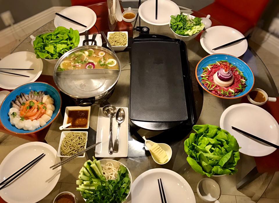 Place the fondue pot and griddle in the center of the table and arrange all the dishes around it.