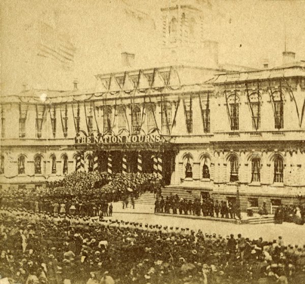 Lincoln’s remains were displayed at New York City Hall for the remainder of the day and night on April 24. The coffin was placed at an angle, so people approaching on the staircase leading to the rotunda could see his face all the way up. However, the approach to the staircase was so narrow and dark that just 80 people per minute could file past the remains while a crowd of at least 500,000 waited outside under brilliantly sunny skies. It was a poorly conceived decision by the city fathers to host the president’s remains in such cramped quarters. Countless thousands of mourners never got their chance to enter the building by the time it closed for the night.