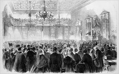 Lincoln was taken by carriage to the Ohio Statehouse where the combined houses of the state’s legislature (called “General Assembly”) waited to hear him speak. From the print showed above (courtesy Library of Congress), the building was jammed with people. Abraham Lincoln spoke to the Assembly, but the speech was unmemorable and included a strange statement when he claimed that “nothing was going wrong” in the country and that “there is nothing that really hurts anybody.” Even close friends were disappointed by his speech in Columbus and for that matter, in Cincinnati and Indianapolis as well.