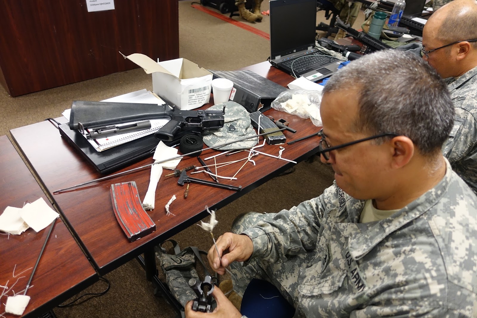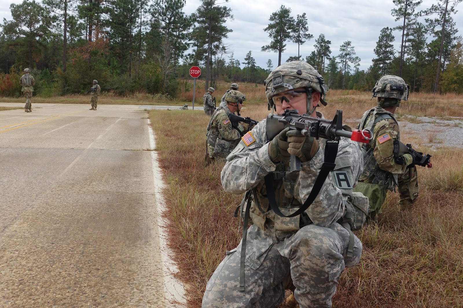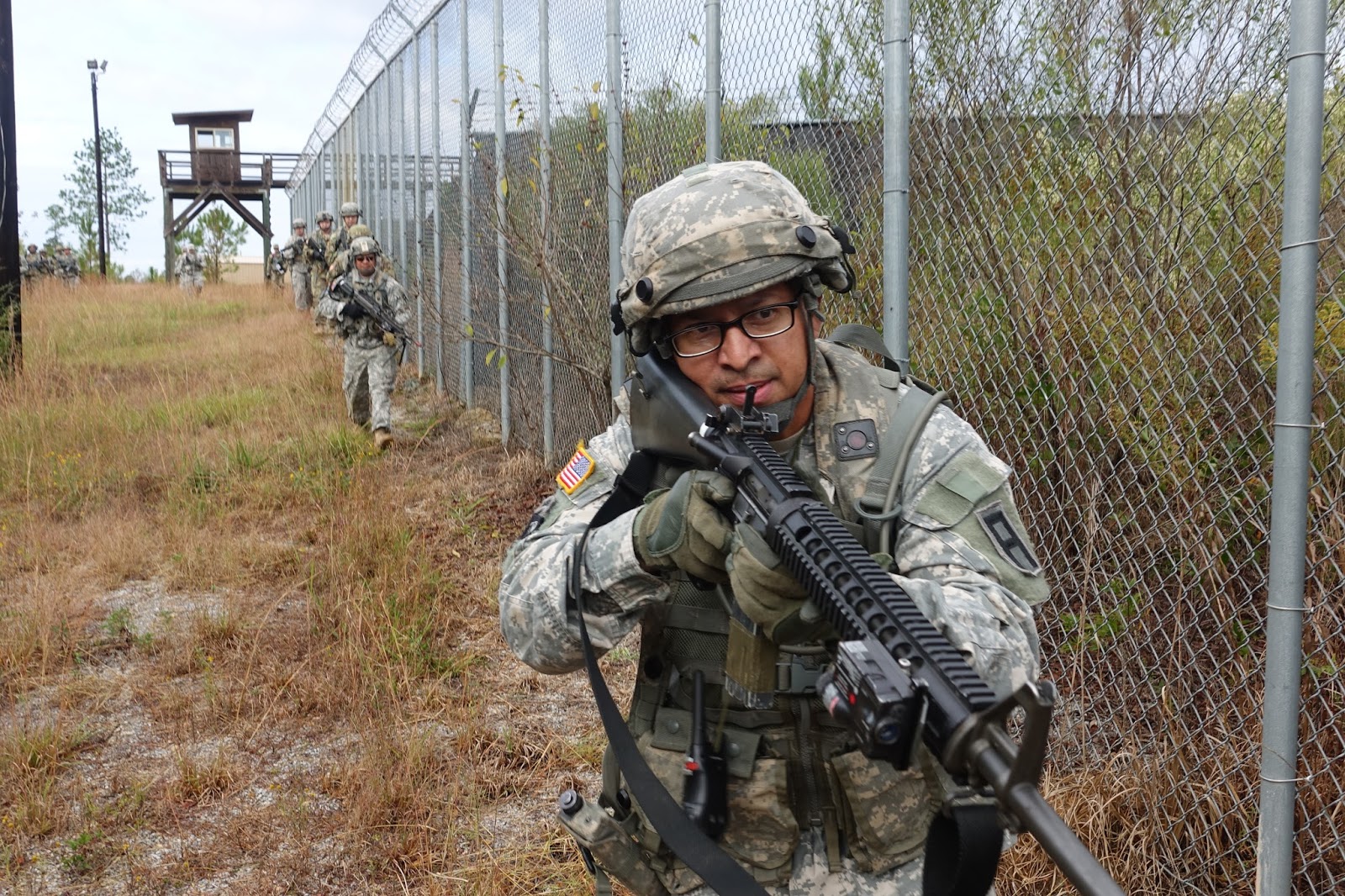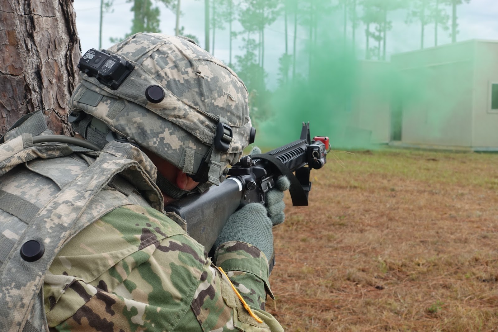 This soldier’s M16 rifle is fitted with a blank adapter (red).