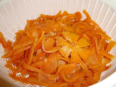 Drain the peels. Keep the syrup to make lemonade hot tea or you can reuse it to make another batch of candied orange.