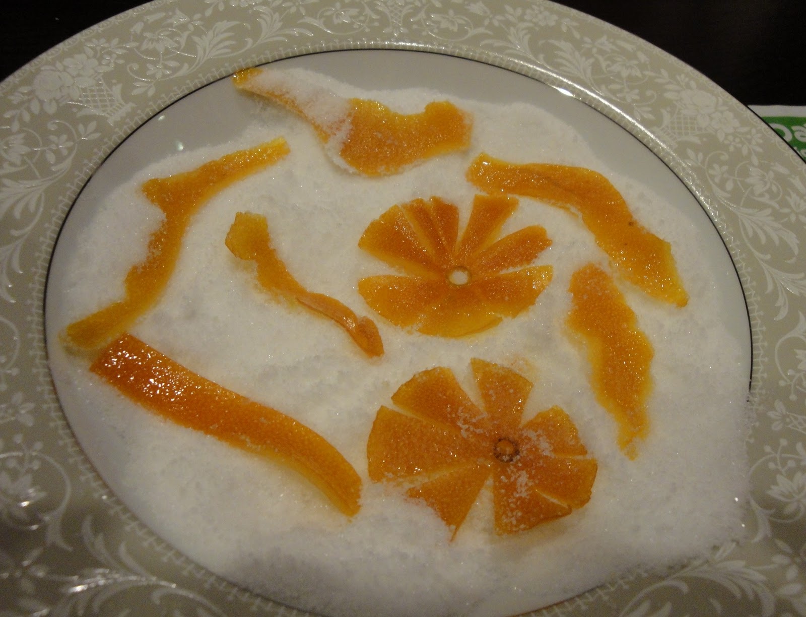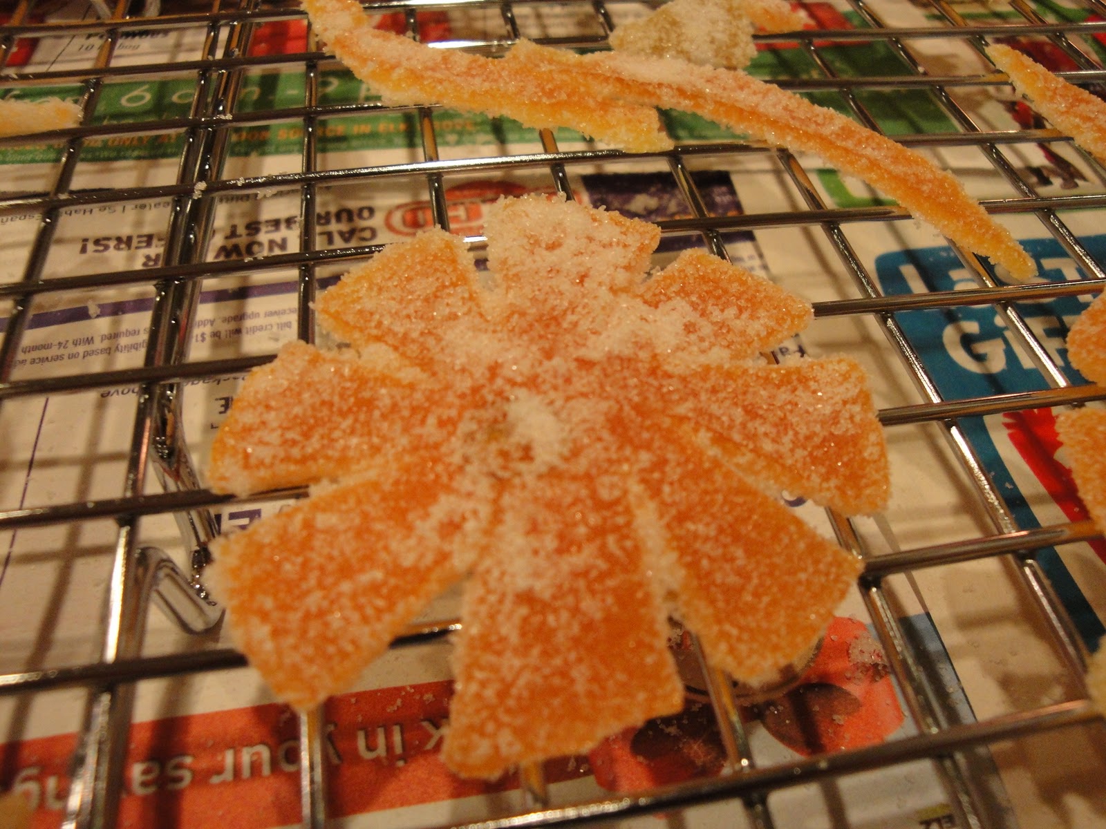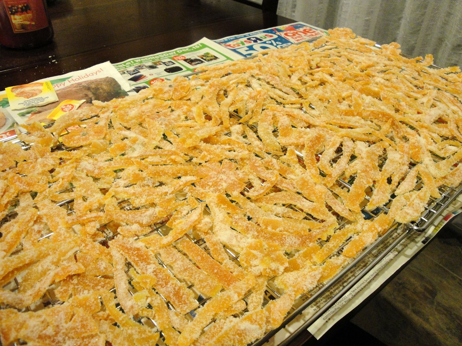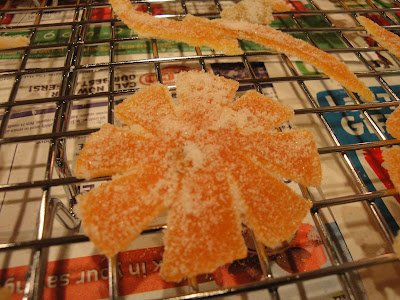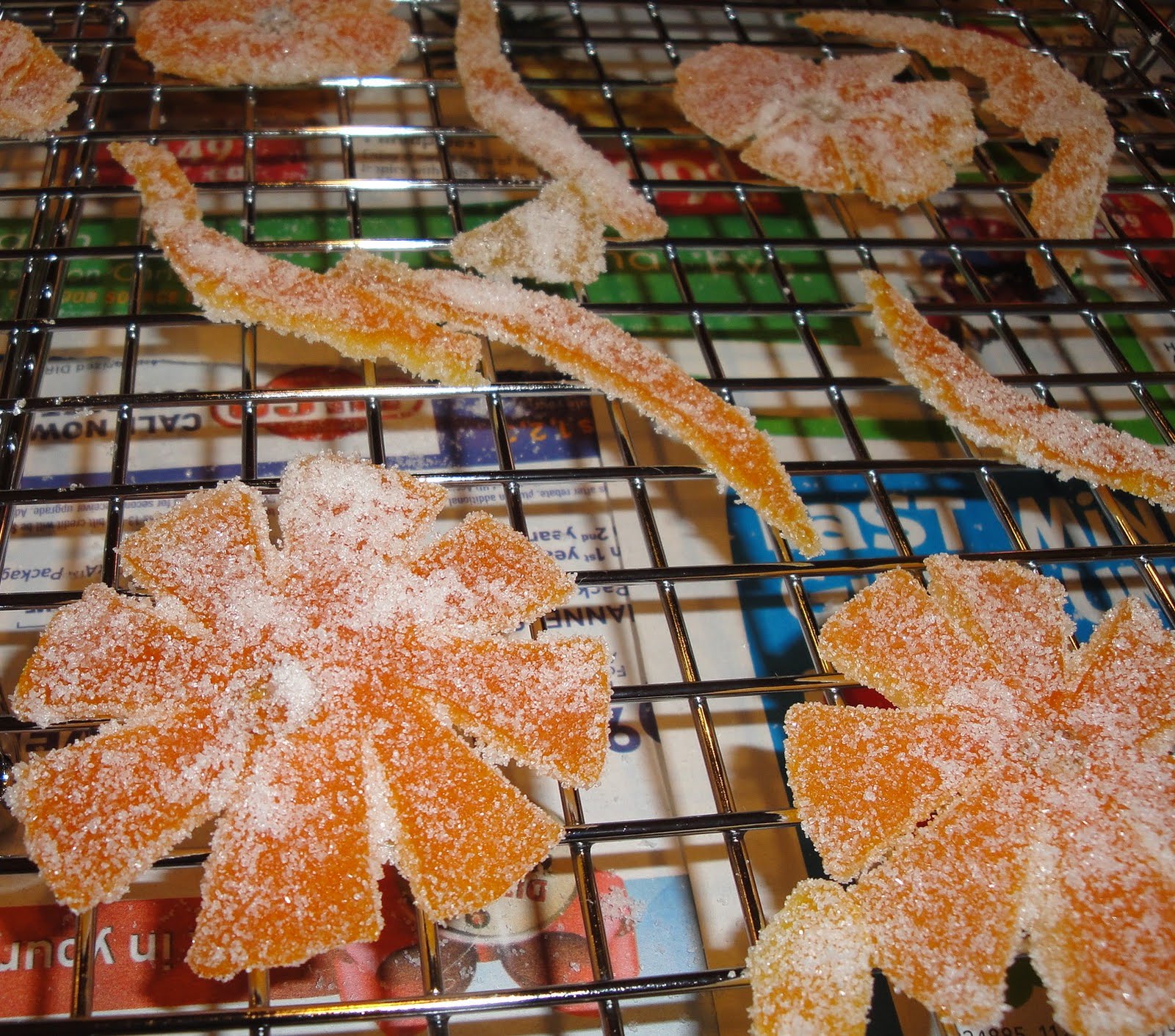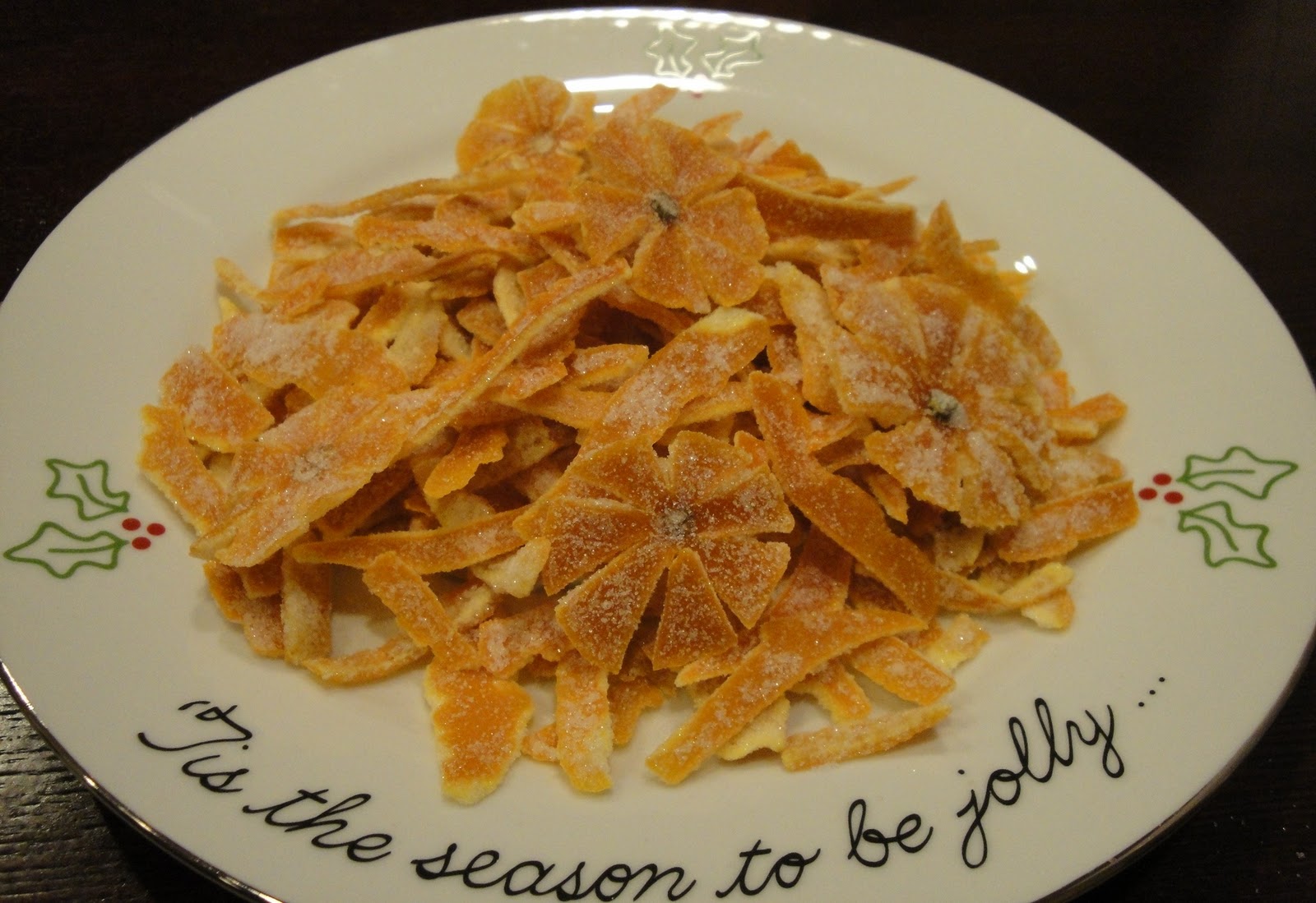 Place 1 cup of sugar in a deep plate. Dredge the peels in the sugar until they are coated, and place them on a cooling rack to dry for a 4-6 hours. You can also place them on a baking sheet lined with parchment paper and place the baking sheet in a warm oven at 200 degree and allow them to dry out. It should take about one hour. Make sure to check them often to prevent burning.