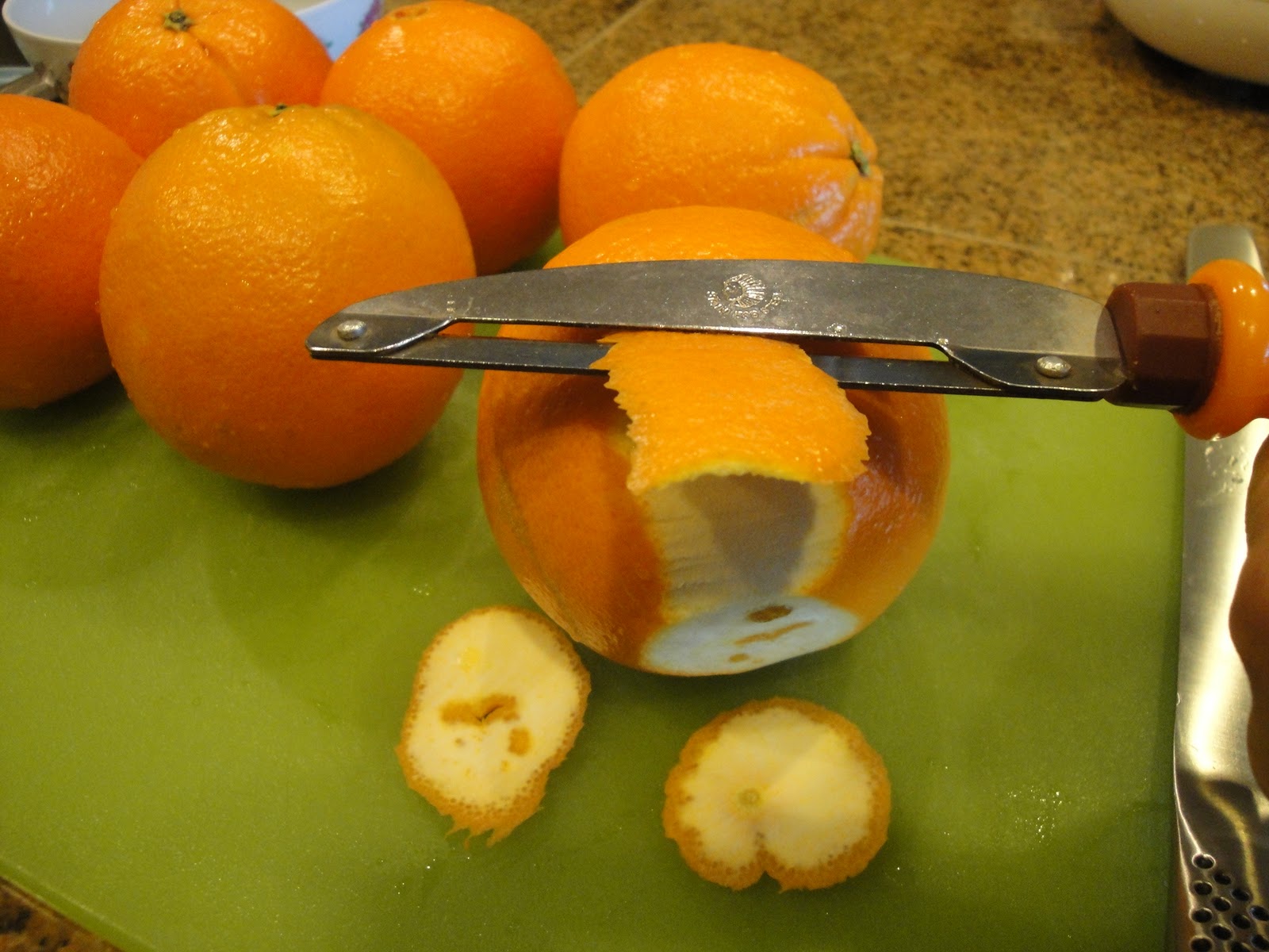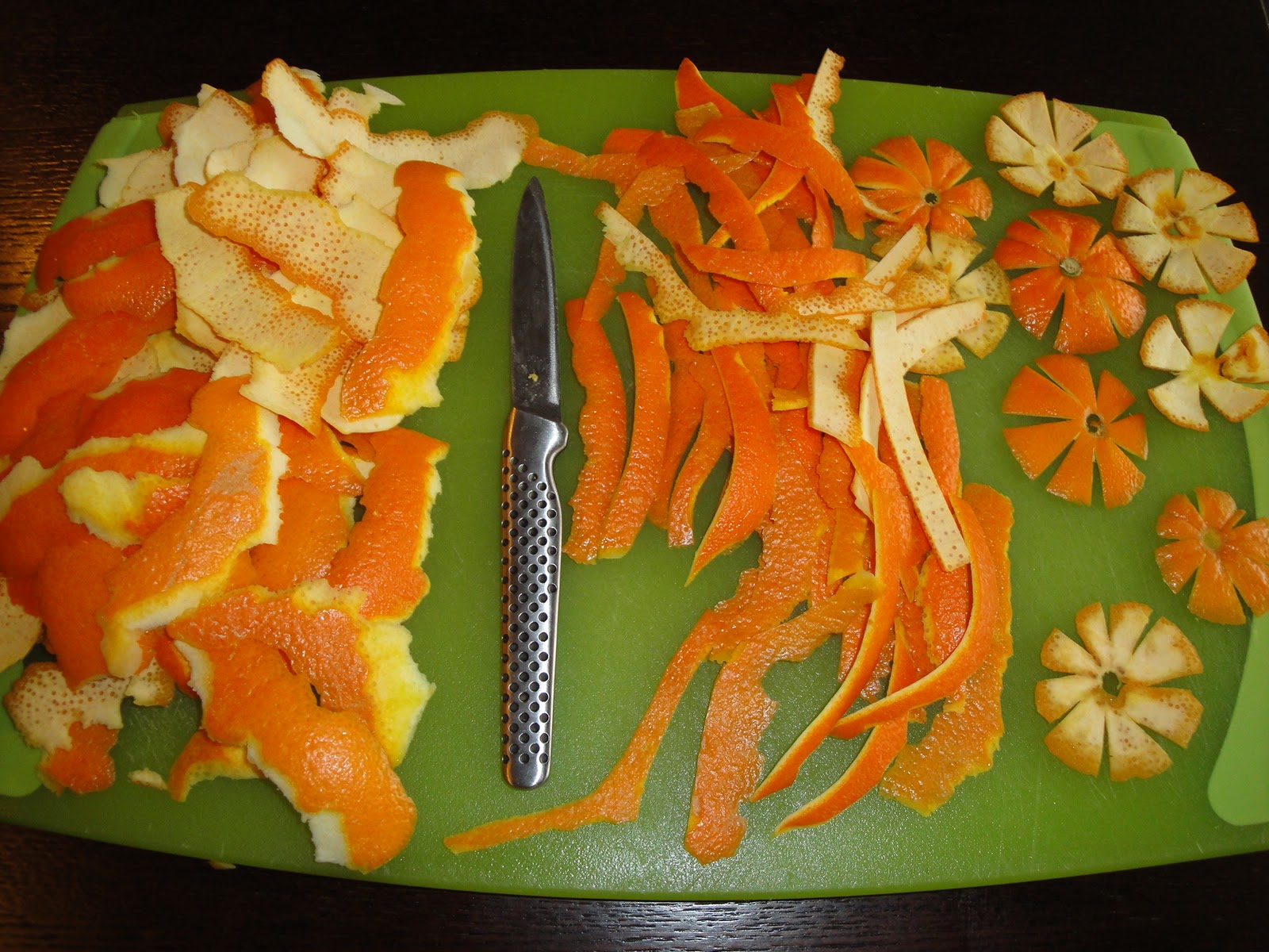 Cut the top and bottom of the orange then make them into flower shapes. Using a vegetable peeler, peel off pieces of the skin, cutting from top to bottom. If you want a longer length, peel all around the orange. Cut the peel into strips about 1/4-inch wide or leave in natural shaped pieces.