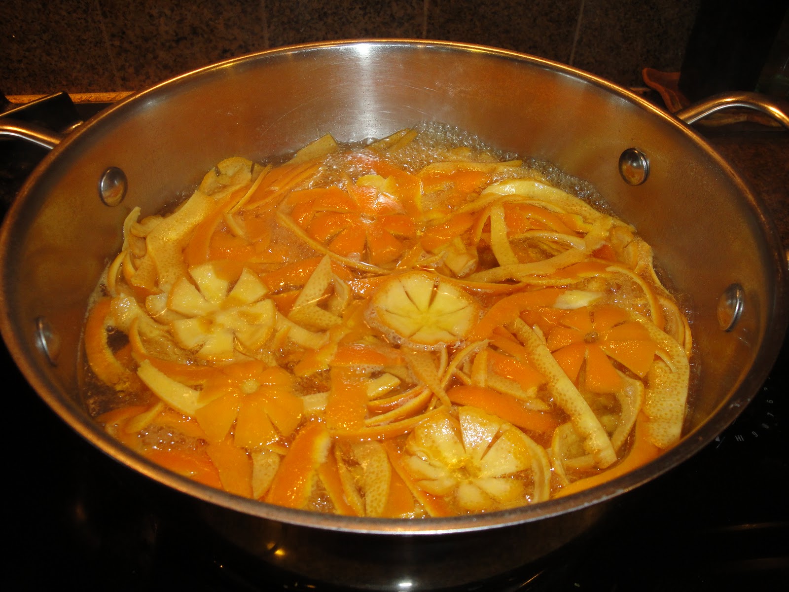 Place peels in a sauce pan and with water to cover. Bring to a boil with high heat and simmer for a couple minutes. Drain and repeat two more times depending on how much of the original scent you want to preserve.