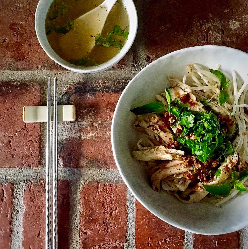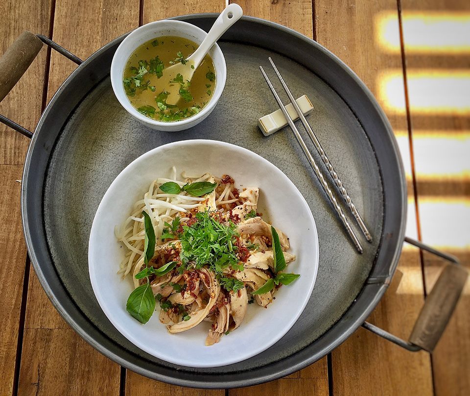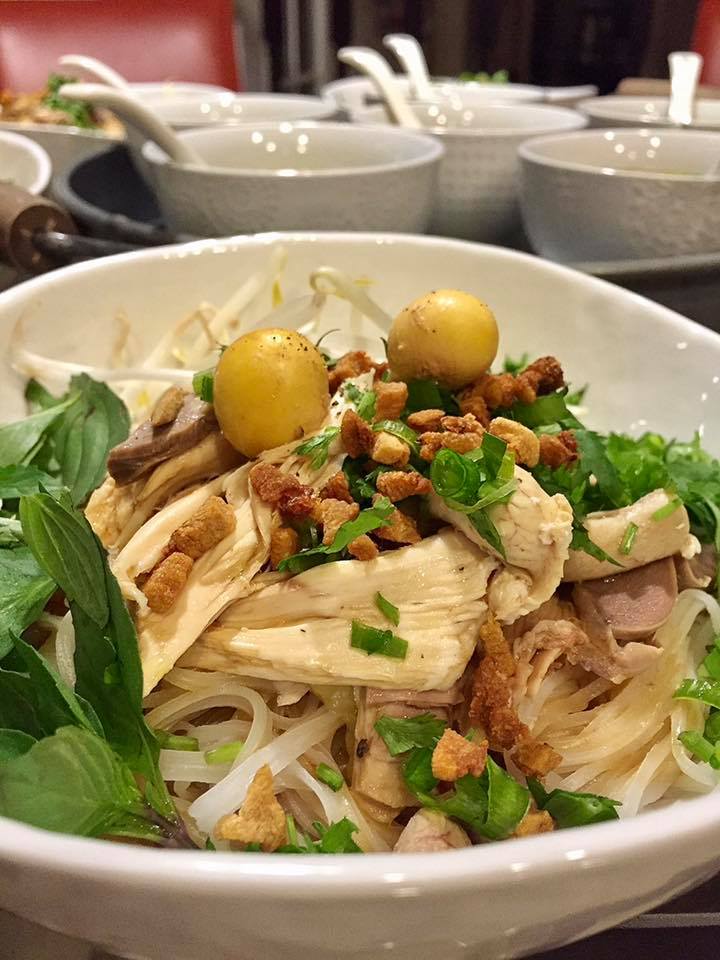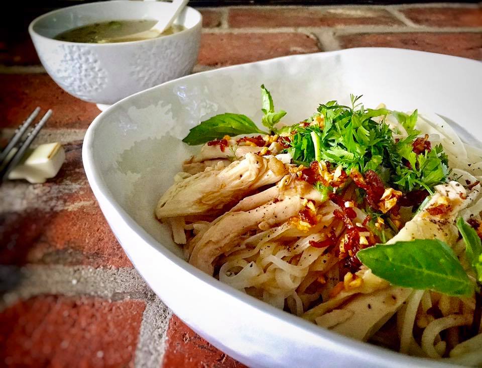 Place noodle into a bowl. Top with shredded chicken, fried pork fat, fried shallots, chopped herbs, and sprinkle some black pepper.