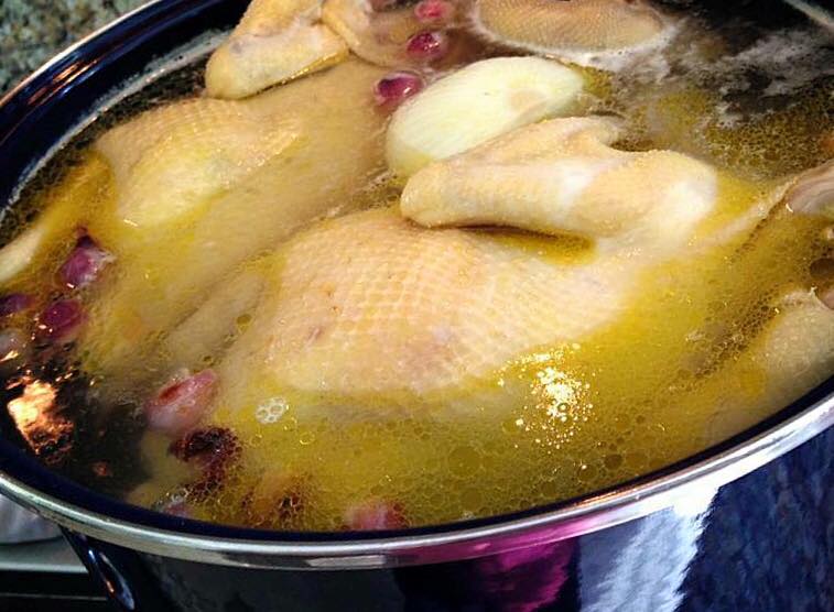 Discard any excess fat from a hen. Rinse hen with cold water and place in a stockpot. Add the water (just enough to submerge the hen), ginger slices, onion or shallots, garlic, rock sugar, salt, and bring to a boil. Once the water is boiling, turn off the heat, cover with a lid and let the chicken sits for another 10-15 minutes.