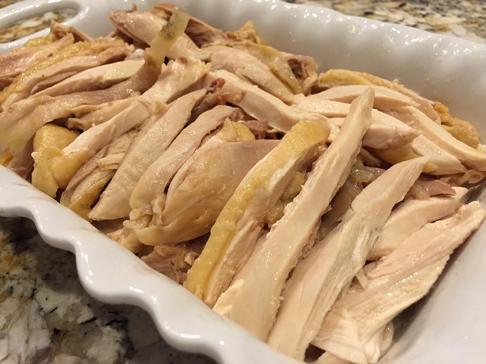 Remove the chicken, let cool, and shred or cut the meat. You can also cool down the chicken quickly by placing in ice and water.