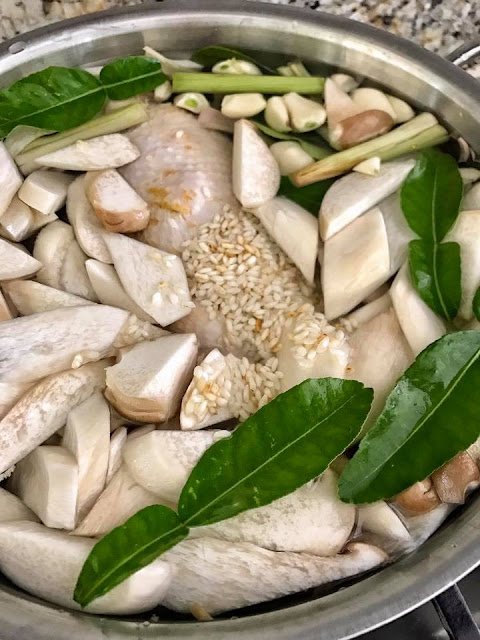 What I enjoy most about this chicken soup is the zestiness of the broth. The roasted rice and the preserved lemon in this soup give it a nutty and sharp citrus kick. Cooking the king oyster mushroom in this soup also brings out a savory umami flavor that goes well with the velvety, meaty texture of the mushroom that reminds me of abalone. And lastly, the distinct earthy aroma of lemongrass, kaffir lime leaves, and garlic make this a hearty, comforting, yet light and nourishing soup.