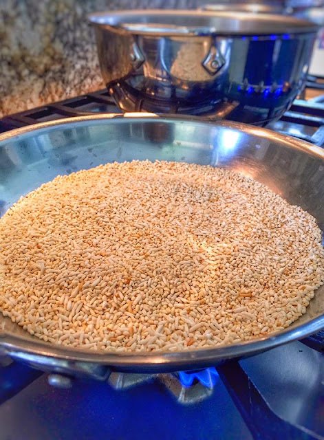 I always toast my rice first when cooking porridge or any kinds of soup to give it a nutty flavor that complements the soup perfectly. This process takes only a few minutes and it will add an extra layer of depth to the dish. Wash the rice for a few times until water is clear. Drain well. Place rice in a skillet over low heat and stir the rice in the skillet constantly for about 10 minutes until you start to smell the nutty heat and the rice start to turn golden brown. Remove the rice from the heat.